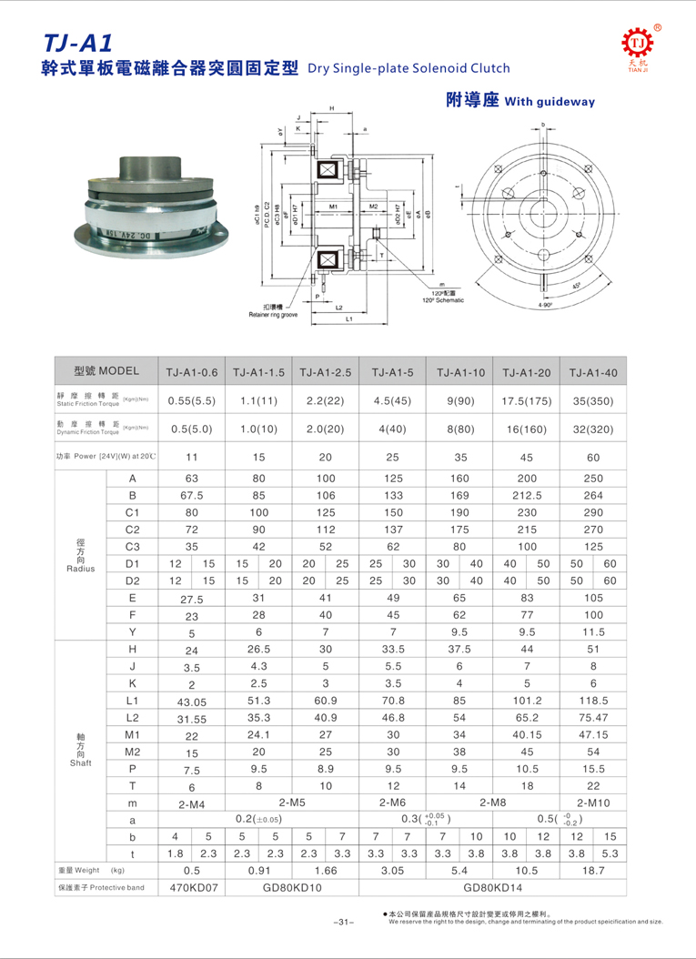 東莞天機傳動(臺灣天機牌)電磁離合器生產廠家制造銷售的單片電磁離合器又稱突圓型電磁離合器,對應的型號是TJ-A1,主要由:軸承、線座、轉子、鐵片以及導座組成,其在傳動起的主要作用是啟動、傳送速度以及傳送方向等。廣泛應用于機床、卷線機、紙箱機、印刷機、木工機、制紙機、沖床機、制袋機等自動化機械領域。