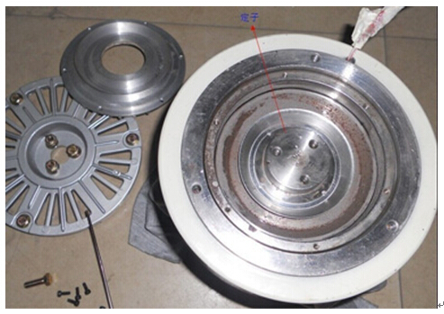 2、 然后用準備好的工具將磁粉制動器端蓋的固定螺栓以及定子固定螺栓擰開,將端蓋取出后,再將擋蓋的幾個固定螺栓擰開并取下?lián)跎w,然后再取出定子。取出定子后,看到就是轉(zhuǎn)子,里面放置就是磁粉(微顆粒狀)。