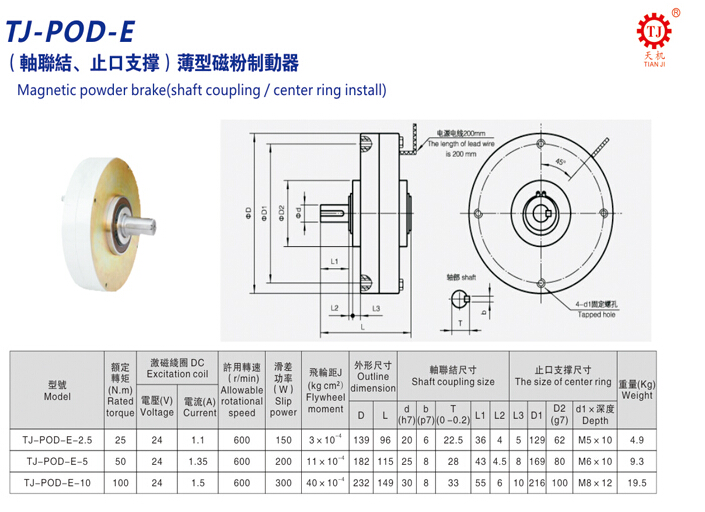 TJ-POD-E型(軸聯結、止口支撐)超薄型磁粉剎車器